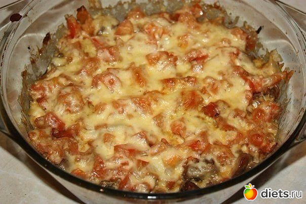 Печень выложить в форму для запекания, посолить, поперчить, посыпать измельченной зеленью и чесноком, сверху выложить слоем нарезанные кубиками помидоры, посыпать тертым сыром, поместить форму в горячую духовку, запекать до расплавления сыра.