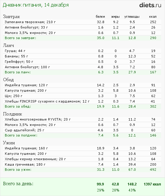 Сегодня я увеличила калорийность и поняла, что при таком рационе мое самочувствие стало лучше, у меня было хорошее настроение! Так что, завтра я начинаю систему Мнус фунт! Ориентиром будет меню ХУДЕЕМ ВМЕСТЕ с изменениями по потребностям организма. Тренировки решила оставить, т.к. система через 2 недели подкорректирует калорийность по моему образу жизни.