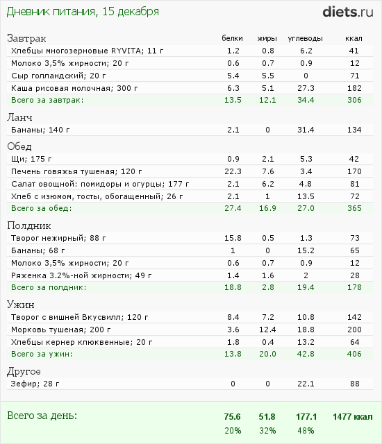 Здорово психика отреагировала на то, что есть можно все, что захочется (в пределах разумного) - совсем не думала о том, чтобы все бросить и "налопаться", калорийность полностью меня удовлетворила! Самочувствие улучшилось: начала появляться активность. А всего лишь 2-й день на чуть повышенной калорийности.