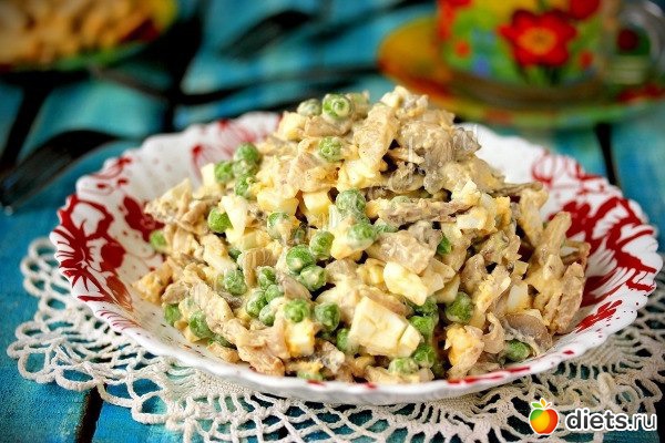 Куриное филе отварите, а затем разберите на волокна. Шампиньоны очистите и нарежьте тонкими кусочками. Грибы обжарьте, посолив в начале, на масле, пока они не начнут зажариваться, а горошек отварите в солёной воде минут 5. Обдайте горошек холодной водой и просушите. Грибы остудите. Яйца (кубиками) соедините с куриным мясом. Добавьте грибы, горошек, немного соли и йогурт. Салат перемешайте и поставьте в холодильник на 30 минут, чтобы он остыл и пропитался. Грибной салат с курицей подайте просто в салатнике или, если готовите его на праздничный стол, придайте ему торжественный вид, украсив по желанию.