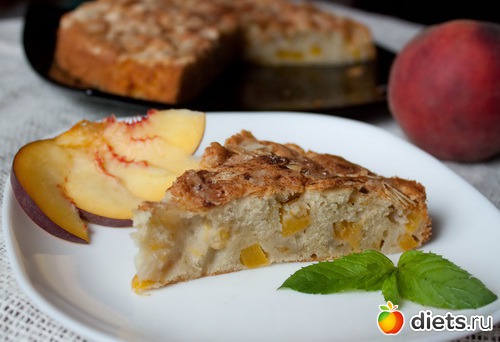 Разогреть духовку до 200С. Персики окунуть в кипяток, очистить, разрезать пополам и удалить косточки. Наполнить форму 1/3 творожной массы. Сверху распределить персики и покрыть их оставшейся творожной массой. Пирог выпекать на нижнем уровне духовки 1 час, а затем оставить еще на 10 минут в выключенной духовке. Остывший пирог посыпать сахарной пудрой.