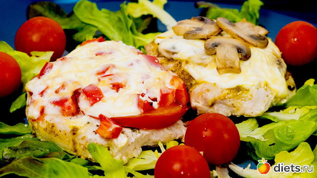 Сочное, нежное, ароматное мясо грудки индейки с помидорами, перцем и орегано или же с грибами и карри, на выбор.