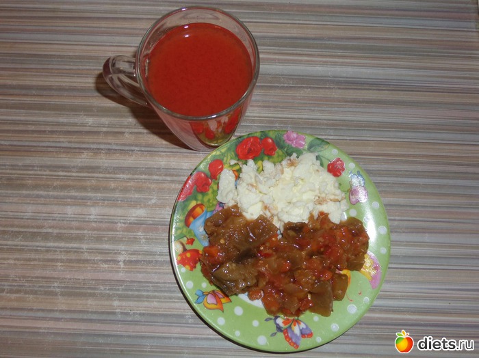 На полдник ела белковый омлет (желтки ушли в пироги, которые я пекла для работы) и острые баклажаны (закатка). А еще в меню числился томатный сок (его я пила целый день).