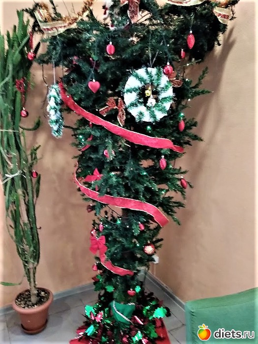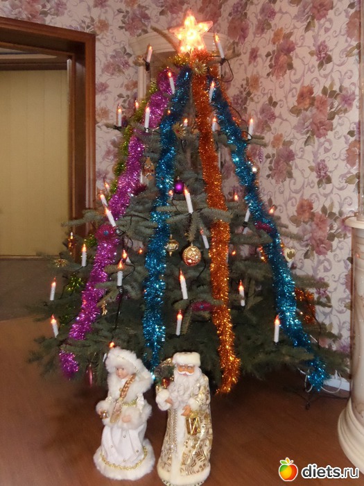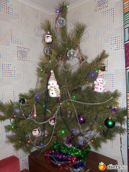 Наконец-то мы нарядили ёлку, точнее ее наряжал муж. Он обещал мне живую сосну две недели, но постоянно не получалось. Поэтому 31 утром проснулся пораньше и купил последнюю из трех оставшихся на ёлочном базаре сосен.