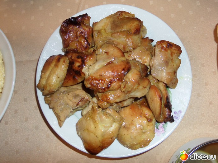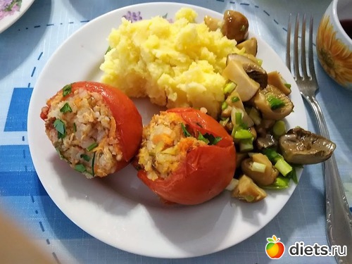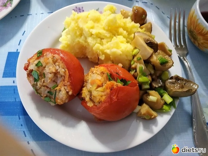 Обедо-ужин прошел в гостях. Старалась выбрать наиболее "крахмальные" блюда из предложенных, поэтому на тарелке картофельное пюре, фаршированные помидоры и салат из маринованных грибов с зеленым луком (все вышеперечисленное мне активно подкладывали, поэтому размер порции стоит увеличить на два).