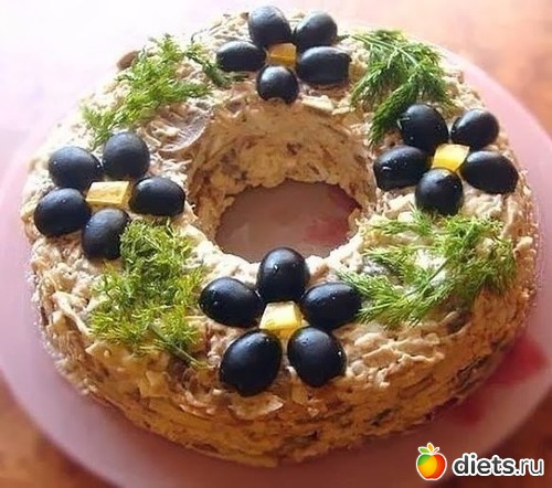 3. На плоское блюдо поставить в центр стакан или бутылку, выложить наш салат и немного придавить его. Затем очень аккуратно вытащить стакан и украсить.