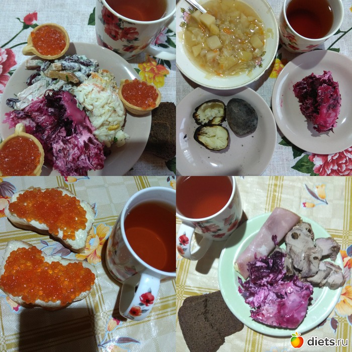 По меню. Ела что хотела. Но старалась прислушиваться к организму и определять чего мне действительно хочется. Заметила что тянет на солёную рыбу. Селёдка под шубой, икра. Видимо не хватает. Я действительно до Нового года убрала по максимуму солёности, что бы не отекать. Вот и результат. Дорвались, называется.