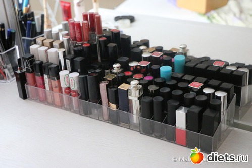 Когда я начала все расставлять и мне не хватило 3 подставок для помад, в которой помещается 24 штуки, стало слегка дурно