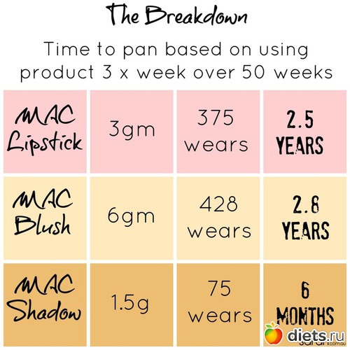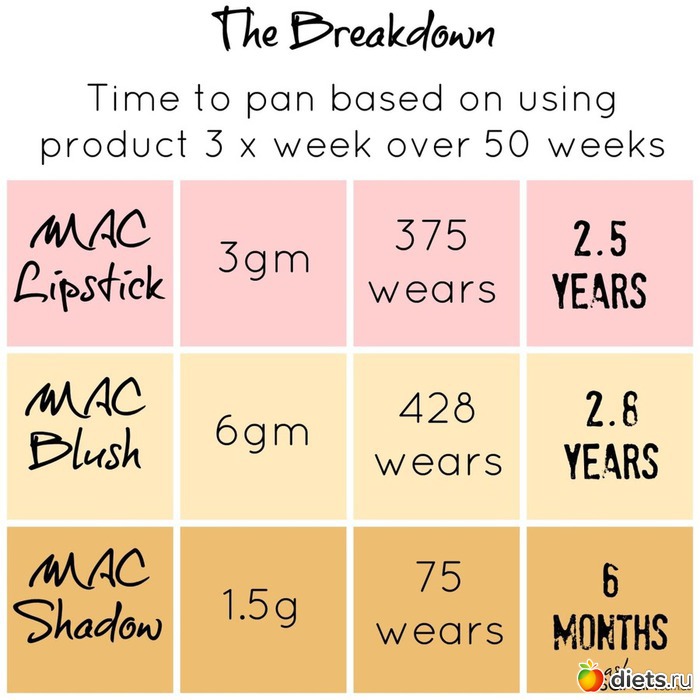 Когда я начала смотреть Youtube, читать блоги, связанные с Project Pan и наткнулась на следующие интересные цифры расхода косметики за одно применение на примере Mac. Сама не проверяла. но очень похоже на правду.