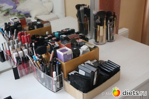 Три туши, трое теней, подводка редко, пудра шариками, пара помад...