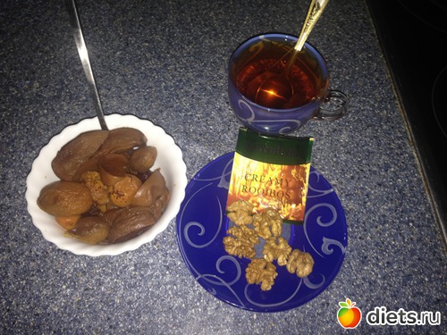 Завтрак: Сухофрукты из компота, орешки грецкие и мой любимый травяной чаек Ройбош