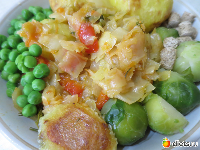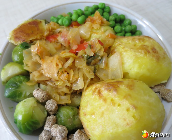 ОБед - карошечка ( картошку отварила предварительно и после в духовке поджарила) + овощи ( капусточку белокочанную потушила с красным перчиком, морковкой и луком). Так же добавила зеленый горошек. Его отварила( решила попробовать купить такой) а то вечно беру в банках консервированный. Такой горошек понравился больше
