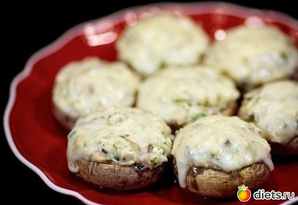 7. Используя 2 столовые ложки, равномерно распределите начинку между подготовленными шляпками шампиньонов. Сверху на начинку насыпьте немного тертой моцареллы.