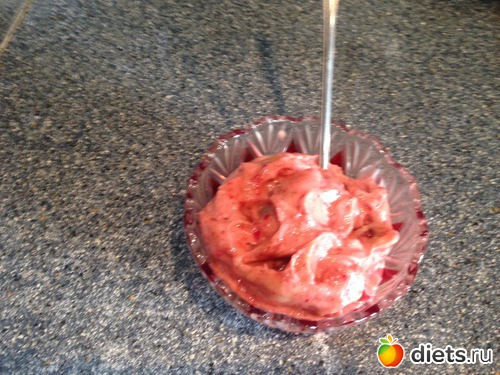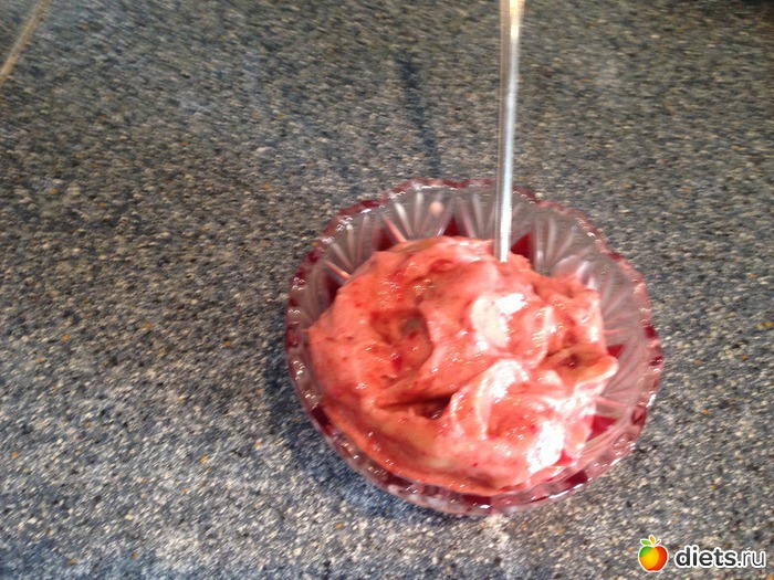 Я брала замороженный банан средний и горсть замороженной клубники, все в блендер до пастообразного состояния,