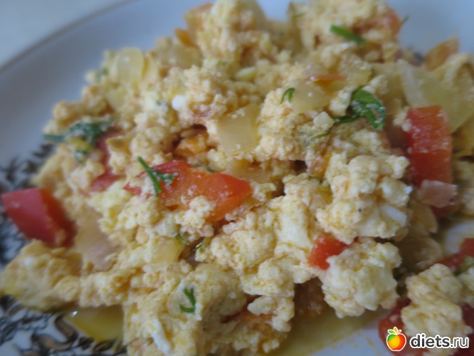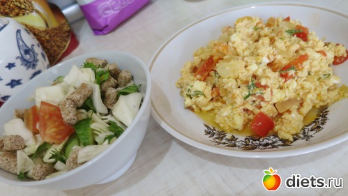 Обед- омлет с овощами ( перец, помидор, лук) + салат свежий (капуста, помидор. огурец) + отруби