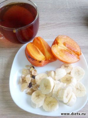 хурма + банан + немного цукатов и изюма + чай без сахара.