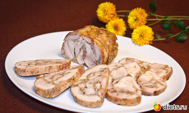 Куриное филе промываем, снимаем мясо с кости и убираем кожу. В ступке измельчаем перец горошком, добавляем горчицу, чеснок и перетираем в пасту. Выкладываем подготовленные большие куски в миску, добавляем соль, паприку, подготовленную пасту, базилик, орегано и 1 ст.л. масла. Перемешиваем. Кусок бумаги для выпечки 40 х 40 сбрызгиваем маслом и выкладываем подготовленные куриные кусочки посередине. Плотно сворачиваем бумагу с курицей в рулет и закрепляем концы. В жаровню наливаем 1 стакан воды, добавляем 1-2 зубчика чеснока и выкладываем подготовленный рулет. Запекаем куриную ветчину в духовке около одного часа. Готовую ароматную курочку вынимаем, остужаем на столе около 20 минут. Отправляем рулет в холодильник на 30 минут. Затем освобождаем от бумаги, нарезаем и подаем.