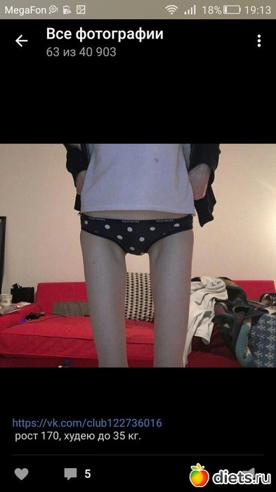 И там сотни и тысячи молодых девушек с весом 47, считающих себя жирными коровами. Девочки, особенно у кого девочки-подростки, следите, чтобы ваши дети не попали в погоне за стройной фигурой под влияние подобных людей. Это же какое-то массовое истребление подрастающего поколения, им же всем рожать, а они хотят весить 38 кг при росте 165. Куда мир катится? У них там прямо шабаш какой-то, они так гнобят, ту девочку, что сорвалась и скушала йогурт, потому что мама заставила, что та им клянется что следующую неделю она даже пить не будет, а только рот смачивать водой. Это ЧУДОВИЩНО! Из этических соображений не называю группы, но найти их легко. Вот лишь самая малость чего я нашла, дальше я читать не смогла! Берегите своих детей! Анорексия -это необратимое смертельное заболевание. Считаю, что анорексия страшнее ожирения...
