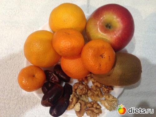Вот такую тарелочку фруктов, орехов, фиников растянула на весь день, перекусывала ими.