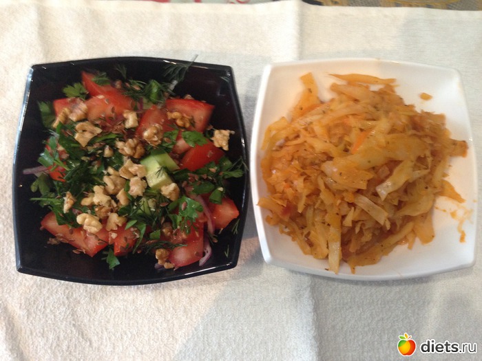 На обед и ужин потушила капусту (свежую и квашенную смешала) и салат овощной.