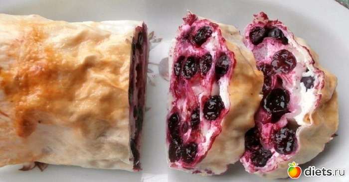 Возьмите глубокую посуду и выложите в нее творог. Добавьте 1 яйцо и 1 яичный белок, хорошенько всё перемешайте. По желанию можете добавить немного подсластитель. Оставшийся желток отложите. Расстелите на столе лаваш и выложите на него творог. Равномерно распределите творожную массу по всей поверхности лаваша. Сверху на творог выложите чернику и сверните рулет из лаваша. Противень застелите пергаментом для выпечки. Аккуратно переложите рулет на противень. С помощью силиконовой кисточки смажьте поверхность рулета взбитым оставшимся желтком. Разогрейте духовку до 180 градусов и отправьте в нее черничный рулет на 25–30 минут