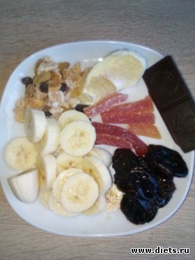 Сегодня углеводный день начался со всяких вкусностей с заморского фрукта свити, дольку которого я мусолю уже второй завтрак, никак не могу съесть, банана, папайи, чернослива и разных мелких цукатов. Вечернюю полоску шоколада, тоже включила в завтрак, но не успела съесть и части всего, муж пришел с дежурства всё смёл с моей тарелки.