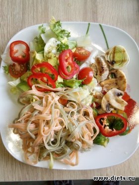 Паста + салат ( листья, помидорки + авокадо) + брюсельская капуста и пару шампиньонов на гриле.