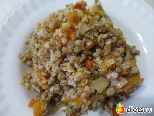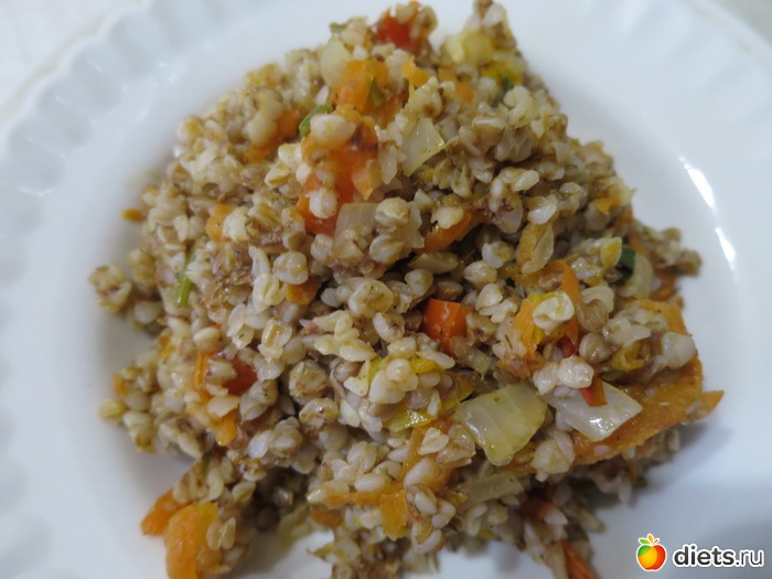 обед - гречка с овощами, плюс капустные оладьи без яиц (тесто на воде и дрожжах)