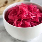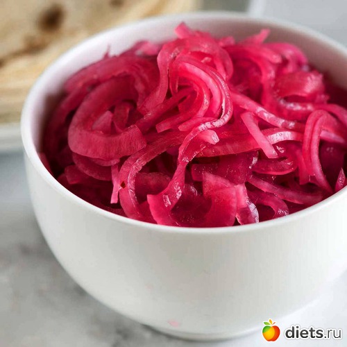 Такой маринованный лук отлично сочетается с блюдами из мяса, в салатах, гамбургерах, брускетах.