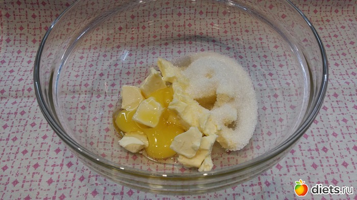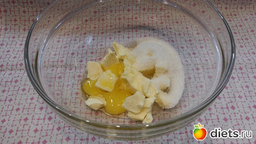 Для начала в миску выкладываю 80 грамм мягкого сливочного масла, щепотку соли, 50 грамм сахара и одно яйцо
