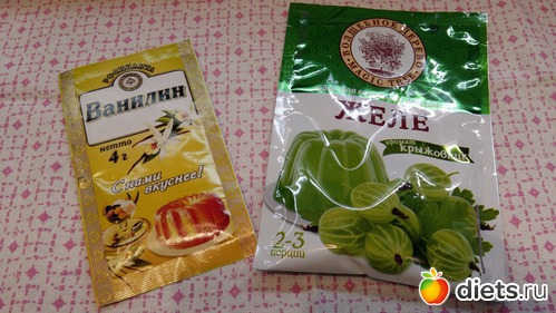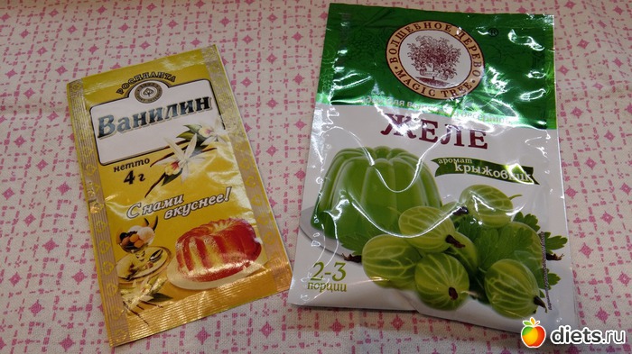 Еще нужно 50 грамм сухого желе, у меня со вкусом крыжовника (можно брать любое) и ванилин