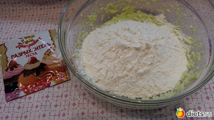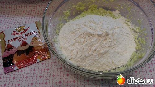 Взбиваю хорошо миксером и просеиваю муку, у меня ушло около 230 грамм и чайную ложку разрыхлителя