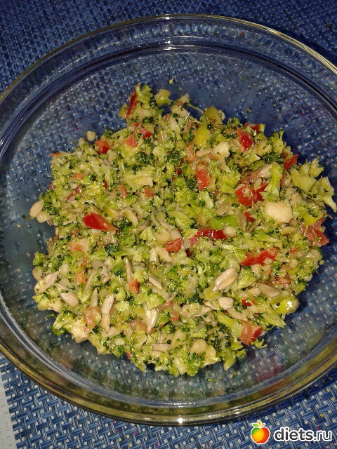 Заправка: 1 ст.л оливкового масла, 1 ч.л. уксуса, 1 ч.л. горчицы и немного меда. Все перемешать и заправить салат. Если используете измельчитель - можно все закинуть сразу с овощами. В оригинальном рецепте соль не используется, но можно добавить щепотку.