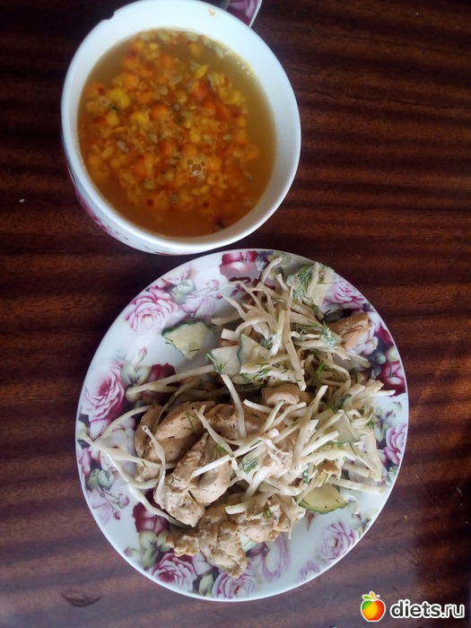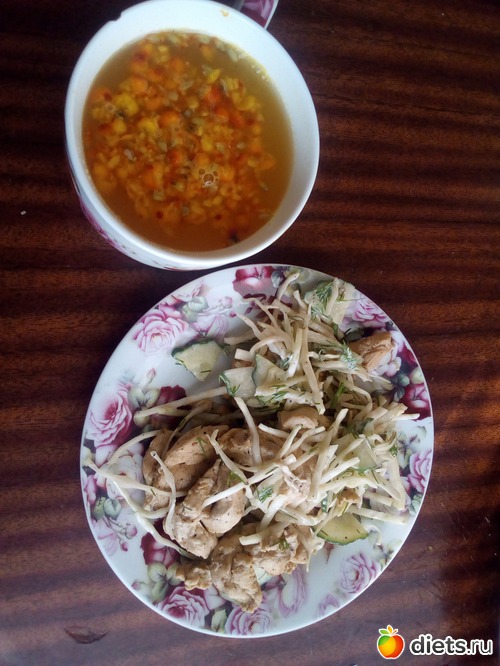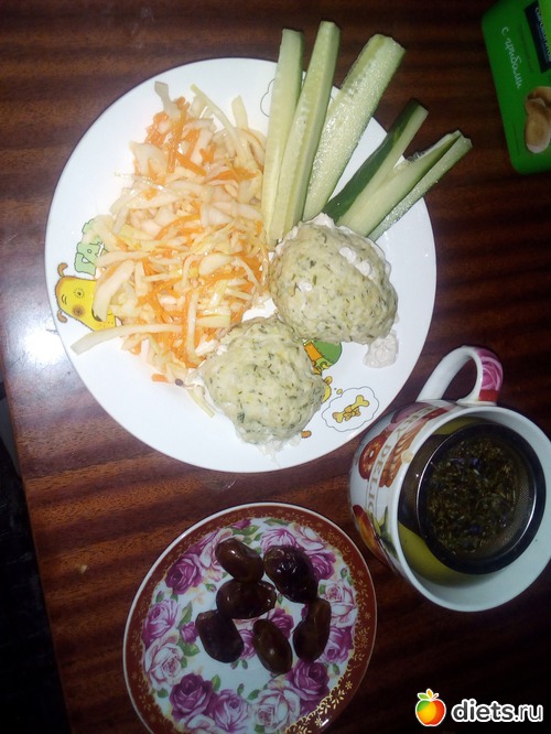 перекус: теплый салат из капусты, огурца и грудки + чай из облепихи
