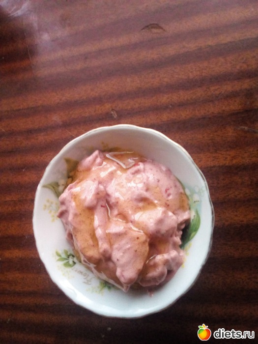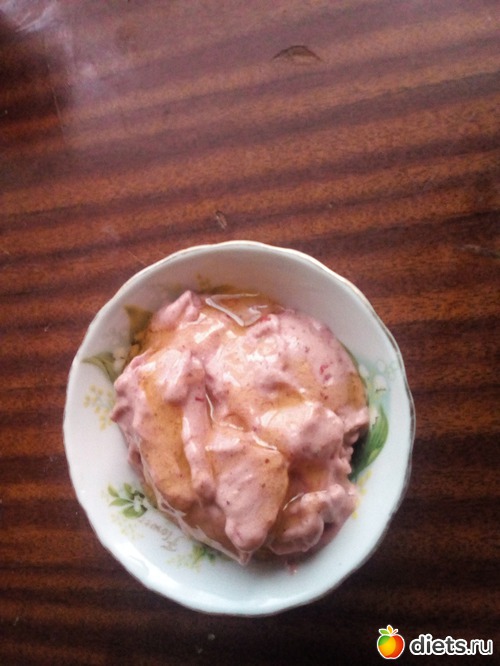 перекус: что то наподобие мороженного состоящего из банана+замороженной клубники+ложки сметаны, вкусно и не обычно мне чем то напомнило томатное мороженное (съела только половину )