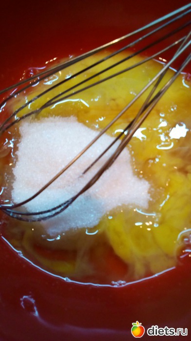 В кисломолочку(у меня сыворотка комнатной температуры) добавить лимонную кислоту. Какое действие и что-расписывать не буду. Мне важен процесс выпечки оладий! Отставить сыворотку -в сторонку. Взобьем яйца с сахаром и солью в пену. Введем яйца в сыворотку.