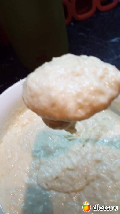 Размешаем тесто до однородного состояния, без комочков. Тесто должно получиться густым-с ложки падать, а не стекать!