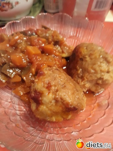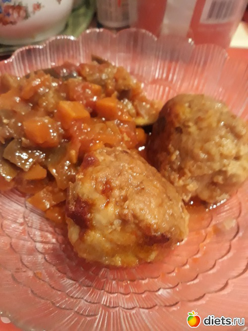 Делала мясные тефтели и тушила овощное рагу-по домашнему(морковь, лук, перец болгарский, баклажаны, зелень, томат-паста, специи)