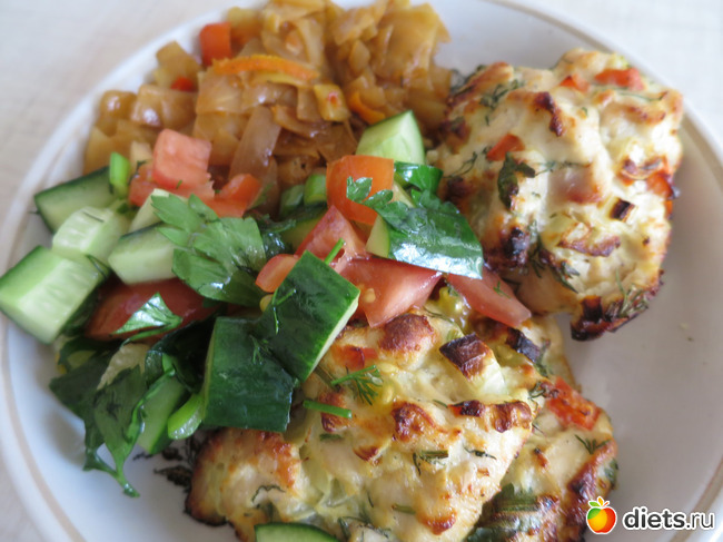 обед - 2 котлетки с овощами куриные рубленые +овощи