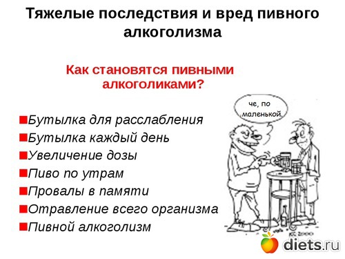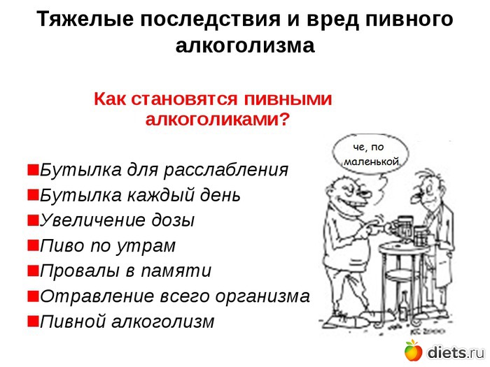 «Пиво — не водка». Действительно, по своим токсикологическим характеристикам пиво с учетом потребляемого количества гораздо хуже водки, оно даже хуже самогона! Ведь производители водки используют для ее приготовления спирт, прошедший специальную очистку. И хотя спирт — это яд, но производители гордятся тем, что очистили его от сивушных масел — еще более токсичных веществ. Иногда можно встретить советы давать столовую ложку пива младенцам для лучшего сна, и это действительно работает. Однако, не говоря уже о побочных наркотических веществах, отметим лишь действие спирта на малыша. На организм ребенка этанол действует в 5 раз сильнее, а если еще учесть, что его масса в 12—15 раз меньше массы его мамы, то эта доза в 15 г пива эквивалента 1 л для взрослого. Если его мамаша еще не является поклонницей хмельного зелья, то она может живо представить себе то оглушенное, тошнотворное состояние, которое у нее вызвал бы литр пива, выпитый залпом без закуски. Даже один такой эксперимент — это издевательство над ребенком, а вот если поить молодую маму таким образом насильно в течение месяца-двух, то потом ей уже прямая дорога в наркологический диспансер — она пивной алкоголик.