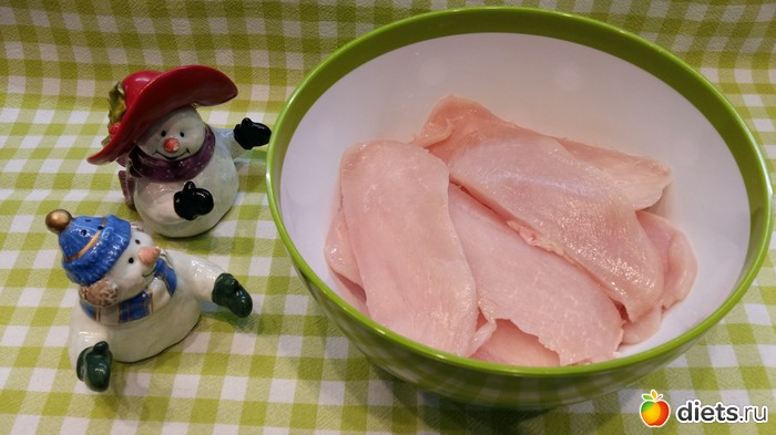 Приступим. Для начала нужно нарезать куриную грудку на тонкие пластины, лучше чтобы грудка была подморожена, так проще нарезать. Куриной грудки примерно грамм 500 у меня