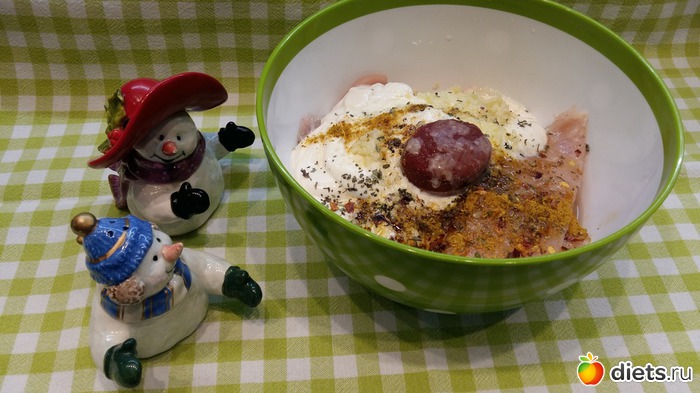 Выдавливаю 3-4 зубочка чеснока, добавляю столовую ложку майонеза (в принципе и без него можно обойтись) и 5 столовых ложек сметаны или натуральный йогурт. Так же специи по вкусу для курицы
