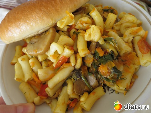 обед -макароны с грибами и овощаами +пирожок с капустой