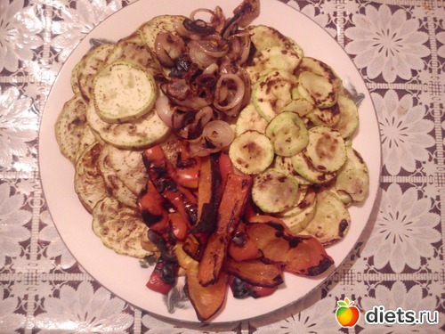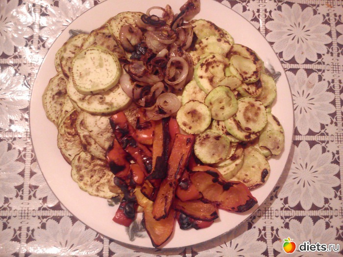 Обед – овощи - гриль по-домашнему (кабачки, баклажаны, перец, лук) с острой сальсой. Лучше бы подошёл соус песто, но песто, который продавался в магазине, смутил меня своим составом.