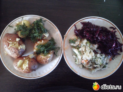 В субботу ездила к родителям, поэтому обедать и ужинать собралась у них (там же и готовить). Т.к. я сначала ездила по делам, то приехала к ним, когда время было уже давно за обед…. Я просто ворвалась в дом голодной разъяренной фурией с дикими глазами (зрелище не для слабонервных), голод был просто жуткий, не раздеваясь, слопала банан, немного полегчало. Сразу же начала готовить: помыла, обмазала маслом и солью и быстро поставила картошку в духовку, 30 минут пускала слюни, глядя на неё через огнеупорное стекло. «Доча, может не надо себя так мучить?» - спросила мама, протягивая мне ароматный, только что приготовленный домашний пирог с рыбой. «Нет, я дождусь своей картошки» - сказала я. Конечно, так голодать нельзя, но это могло случиться и в «недиетный» день, просто вот так получилось.
