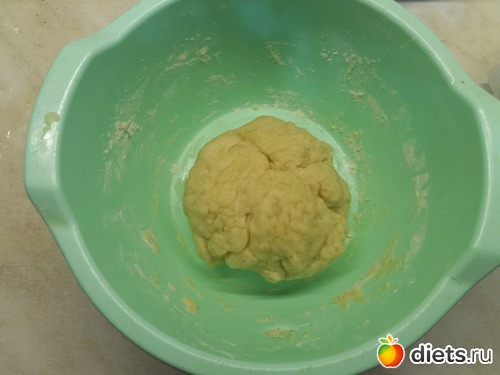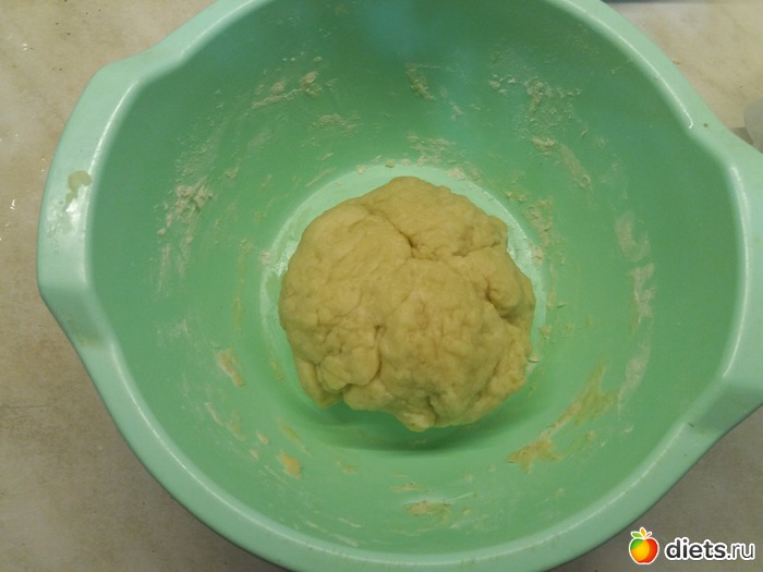 1. Смешала масло с горячей - почти кипящей - водой. Муку просеяла с солью и разрыхлителем. Замесила тесто, оставила на полчасика отдохнуть.