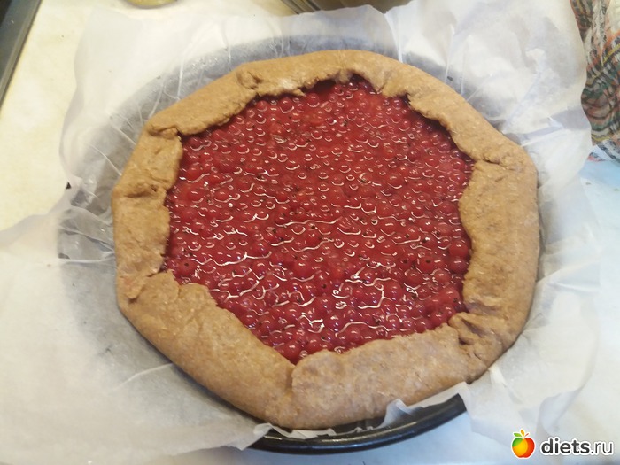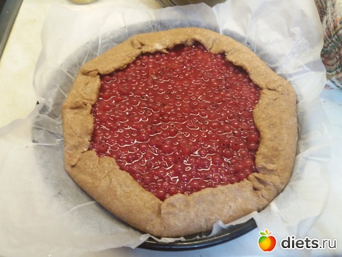 5. Загнула на начинку свободные края теста. Заворачивать нужно свободно, складочками – как получится. Тут такое дело: если сделать бортики узкими, то при разрезании начинка так и будет норовить вывалиться! Поэтому лучше посильнее прикрыть начинку, оставив открытым только самый центр. Кстати, самая вкусная часть пирога там, где ягоды зажаты тестом. Бортики сбрызнула водой, посыпала сахаром. Взяла кусок фольги, подогнула края, сформировав "условный круг" и прикрыла им ягоды, не закрывая теста.
