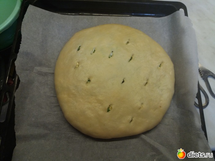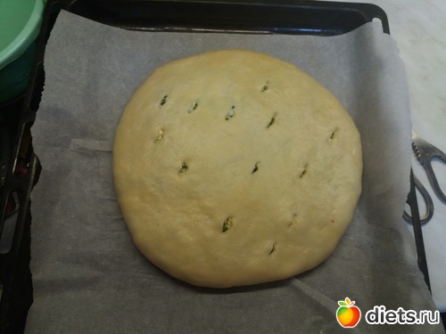 2. Тесто раскатала-растянула в большой круг, сантиметров 40 в диаметре, переложила на противень. Здесь тоже есть нюанс: начинка будет выложена в центр пласта и частично закрыта краями. Поскольку начинка сочная и её довольно много, лучше оставить центр чуть-чуть толще, чем края, подстраховать себя от разрывов теста и потери вкуснейшего сока. Ну и от оттирания противня тоже Smile