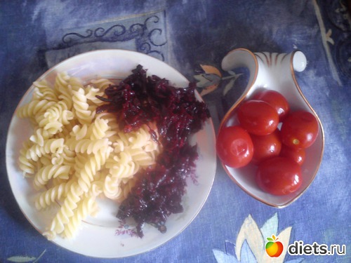 Обед – макароны с томатным соусом (домашним), помидоры консервированные (тоже домашние), снова сделала салат из свеклы с чесноком и оливковым маслом. Ну уж очень мне захотелось. Специально посмотрела: свекла - умеренно крахмалистыйовощ, поэтому не такой уж и криминал, также в защиту свеклы скажу, что она считается одним из самых полезных овощей вообще из всех, плюс гемоглобин. А вот помидорками не сильно увлекалась, из того, что на фото - скушала парочку только.