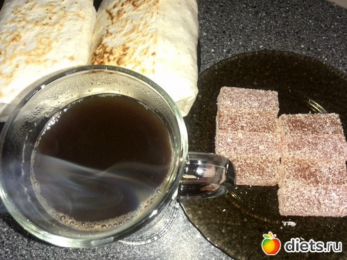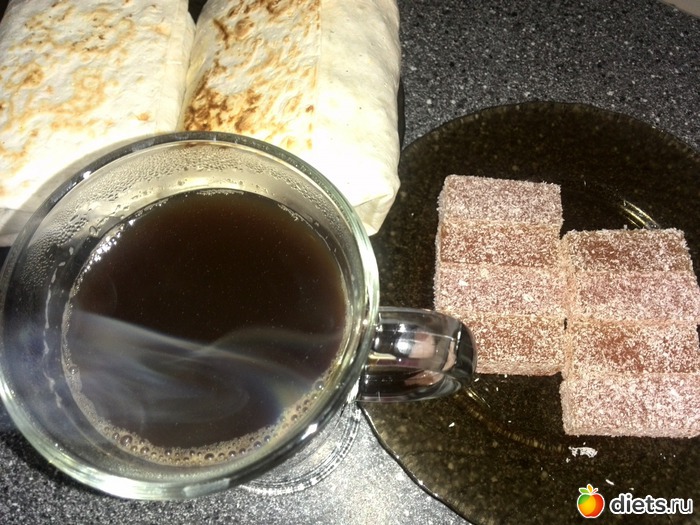 Обед шаурма кофе и мармелад.